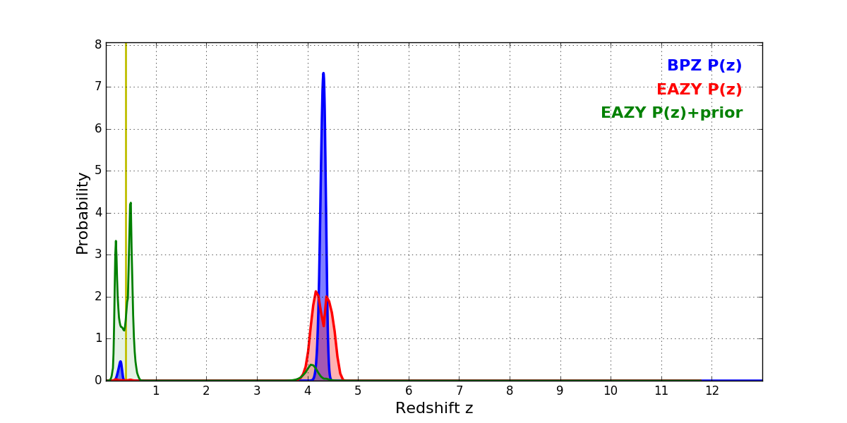 In P(z) plots: Yellow lines mark the cluster redshift z = 0.396,