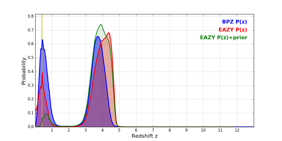 In P(z) plots: Yellow lines mark the cluster redshift z = 0.396,