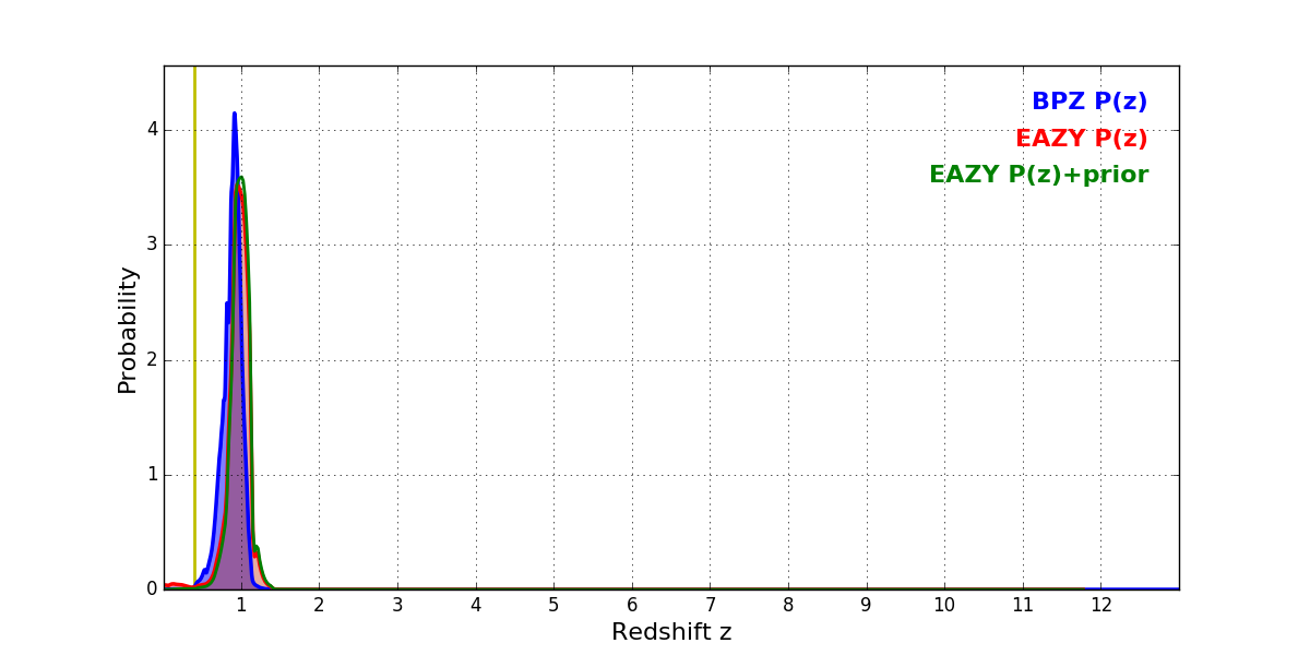 In P(z) plots: Yellow lines mark the cluster redshift z = 0.396,