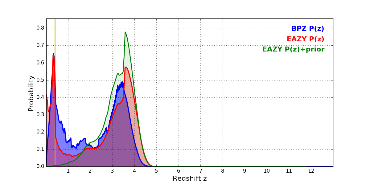 In P(z) plots: Yellow lines mark the cluster redshift z = 0.396,