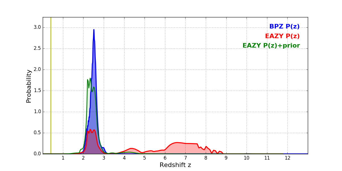 In P(z) plots: Yellow lines mark the cluster redshift z = 0.396,
