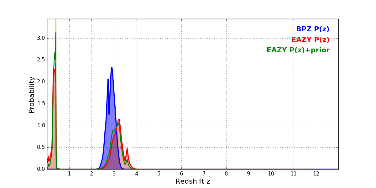 In P(z) plots: Yellow lines mark the cluster redshift z = 0.396,