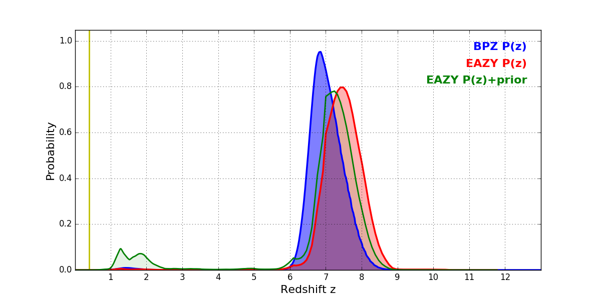 In P(z) plots: Yellow lines mark the cluster redshift z = 0.396,