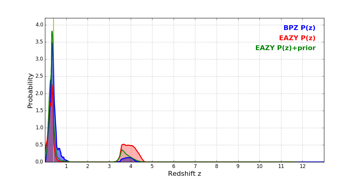 In P(z) plots: Yellow lines mark the cluster redshift z = 0.396,