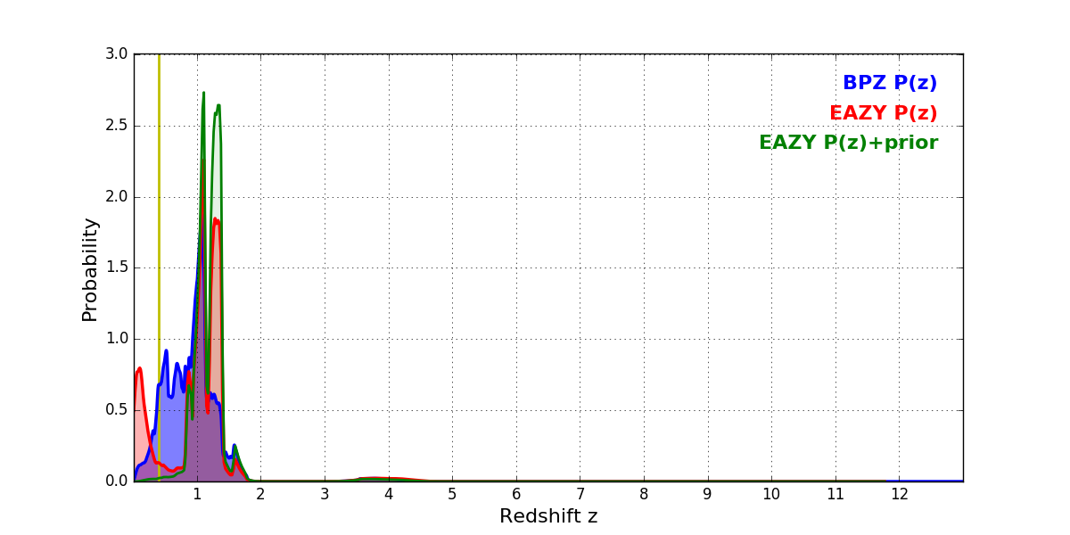In P(z) plots: Yellow lines mark the cluster redshift z = 0.396,