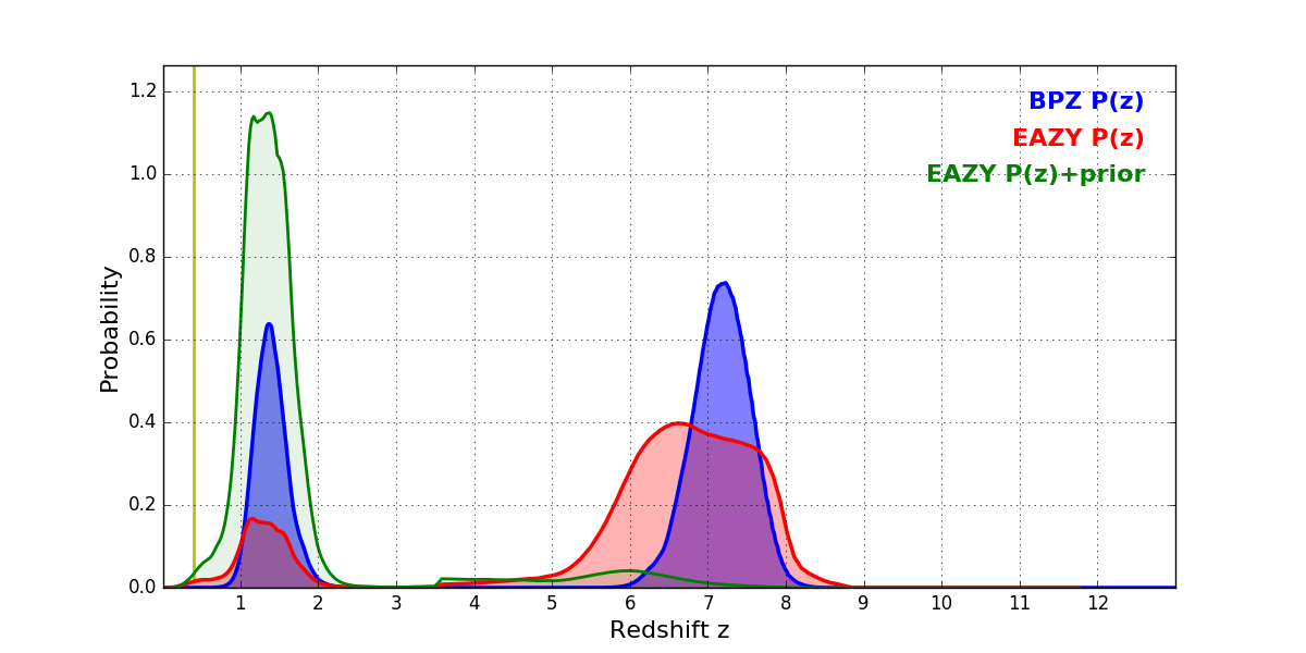 In P(z) plots: Yellow lines mark the cluster redshift z = 0.396,