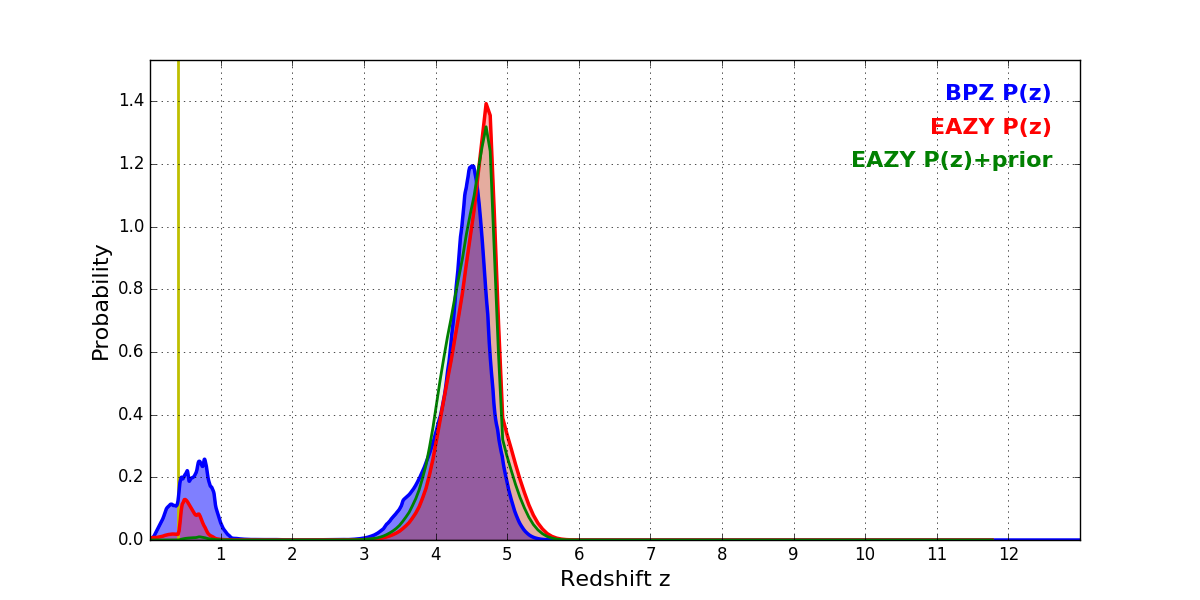 In P(z) plots: Yellow lines mark the cluster redshift z = 0.396,