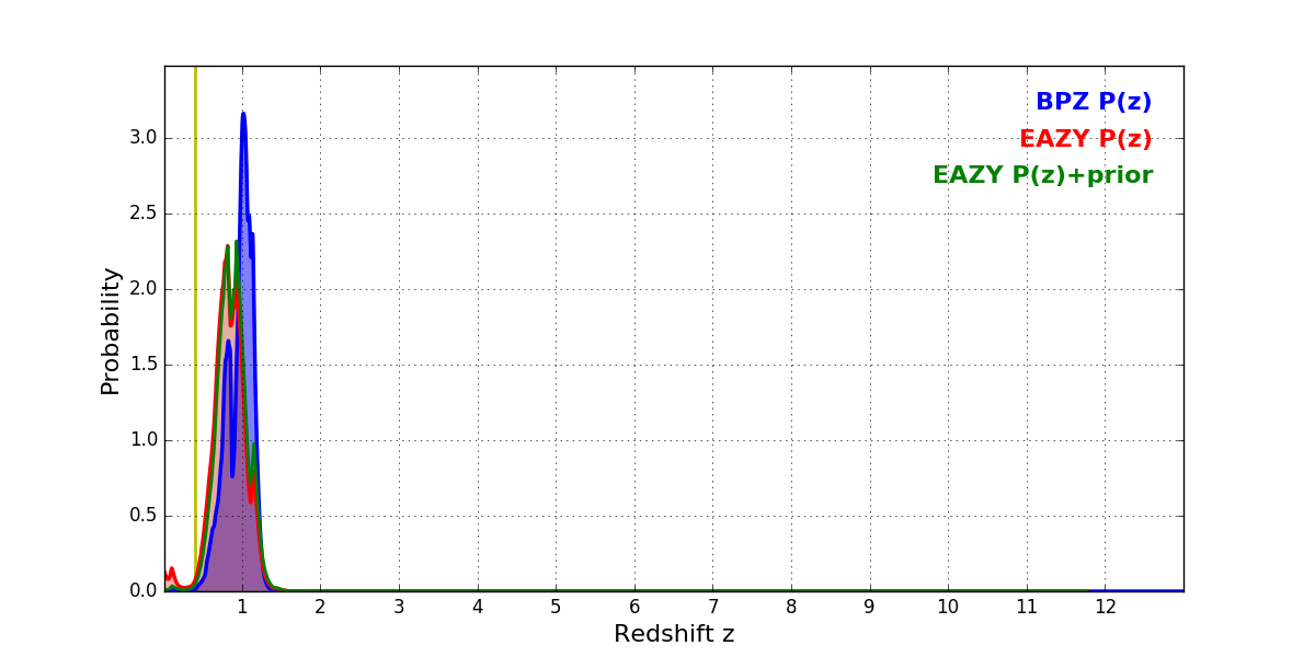 In P(z) plots: Yellow lines mark the cluster redshift z = 0.396,