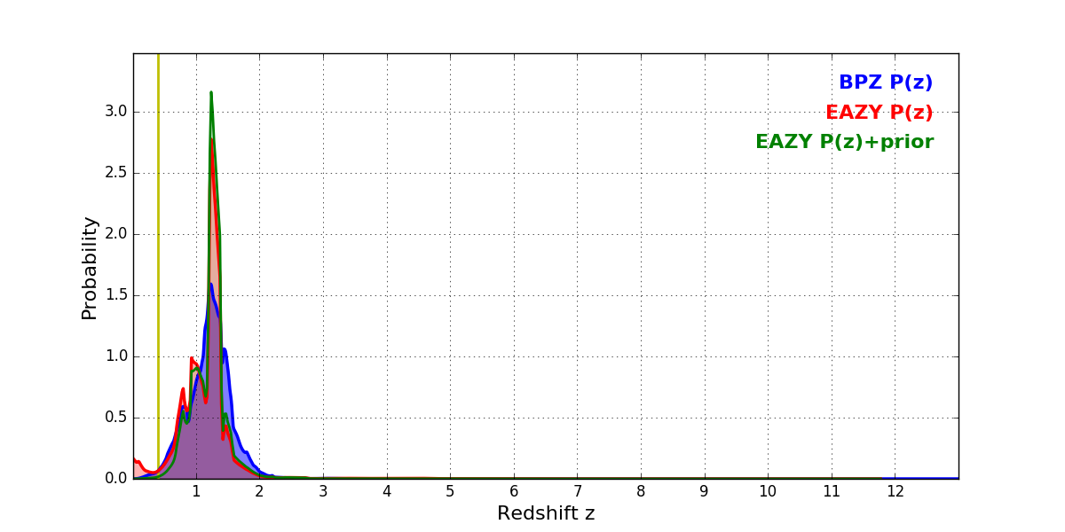In P(z) plots: Yellow lines mark the cluster redshift z = 0.396,