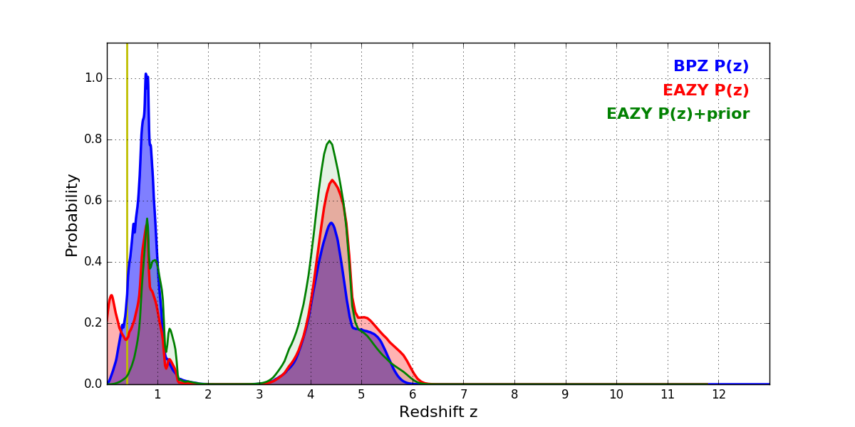 In P(z) plots: Yellow lines mark the cluster redshift z = 0.396,