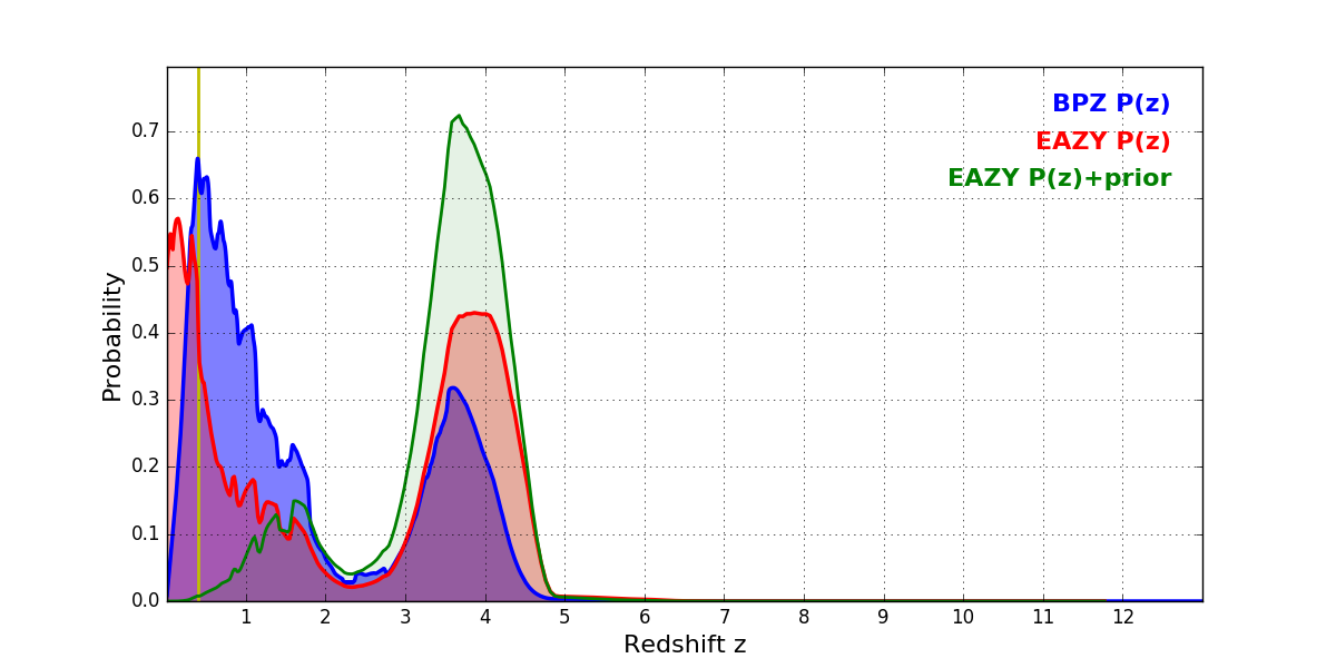 In P(z) plots: Yellow lines mark the cluster redshift z = 0.396,