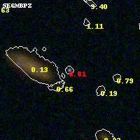 Object #1068 x,y = (1845, 1756) RA, Dec = (01:42:58.488, 44:37:18.48) = (25.74370, 44.62180) BPZ = 0.015 [0.010--0.031] type = 10.20 (SB3_B10 - SB11_A_0_l) chisq2 = 9.66 ODDS = 1.00 z_cluster = 0.341