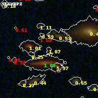 Object #1137 x,y = (2646, 1556) RA, Dec = (01:42:53.976, 44:37:06.60) = (25.72490, 44.61850) BPZ = 1.075 [0.104--3.667] type = 9.10 (SB2_B10 - SB3_B10) chisq2 = 0.57 ODDS = 0.11 z_cluster = 0.341