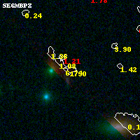 Object #1149 x,y = (2043, 1511) RA, Dec = (01:42:57.384, 44:37:03.72) = (25.73910, 44.61770) BPZ = 1.297 [0.982--7.164] type = 2.00 (Ell6_A_0) chisq2 = 0.47 ODDS = 0.31 z_cluster = 0.341