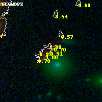 Object #1207 x,y = (2691, 1138) RA, Dec = (01:42:53.736, 44:36:41.40) = (25.72390, 44.61150) BPZ = 0.512 [0.277--4.216] type = 2.00 (Ell6_A_0) chisq2 = 0.41 ODDS = 0.15 z_cluster = 0.341