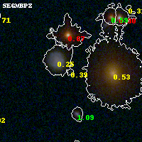 Object #678 x,y = (3416, 2395) RA, Dec = (01:42:49.656, 44:37:57.00) = (25.70690, 44.63250) BPZ = 0.387 [0.080--3.450] type = 9.40 (SB2_B10 - SB3_B10) chisq2 = 0.35 ODDS = 0.10 z_cluster = 0.341