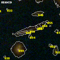 Object #859 x,y = (2608, 2169) RA, Dec = (01:42:54.192, 44:37:43.32) = (25.72580, 44.62870) BPZ = 3.103 [2.984--3.218] type = 7.40 (Scd_B10 - SB1_B10) chisq2 = 0.34 ODDS = 0.99 z_cluster = 0.341