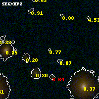 Object #964 x,y = (3023, 2019) RA, Dec = (01:42:51.864, 44:37:34.32) = (25.71610, 44.62620) BPZ = 0.768 [0.199--5.837] type = 8.20 (SB1_B10 - SB2_B10) chisq2 = 0.45 ODDS = 0.08 z_cluster = 0.341