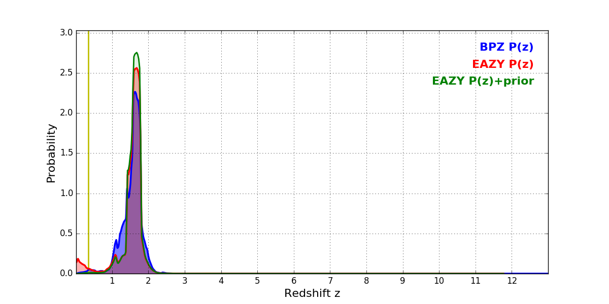 In P(z) plots: Yellow lines mark the cluster redshift z = 0.341,