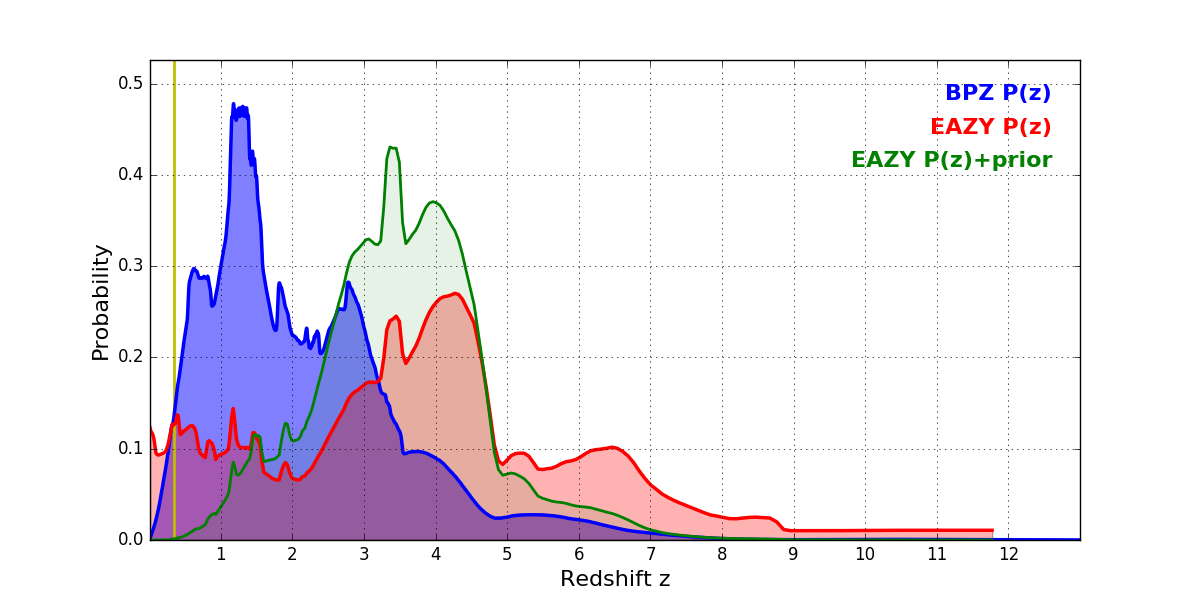 In P(z) plots: Yellow lines mark the cluster redshift z = 0.341,