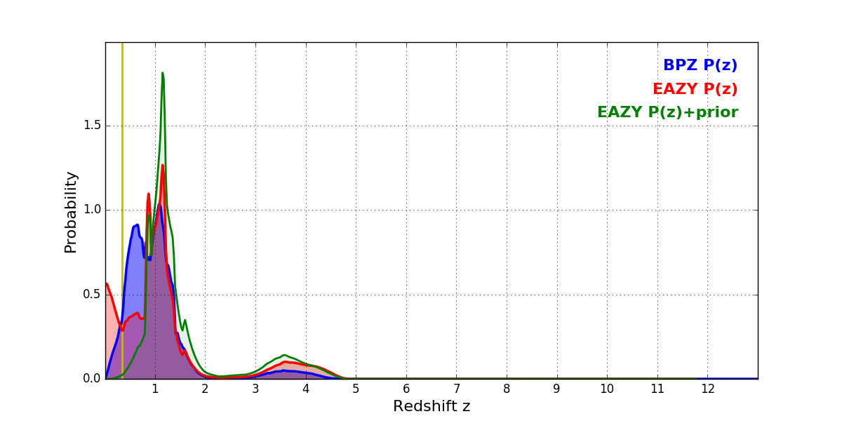 In P(z) plots: Yellow lines mark the cluster redshift z = 0.341,