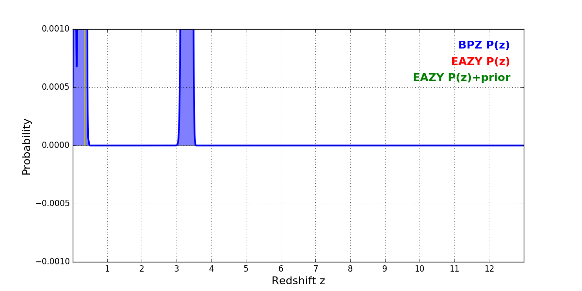 In P(z) plots: Yellow lines mark the cluster redshift z = 0.341,