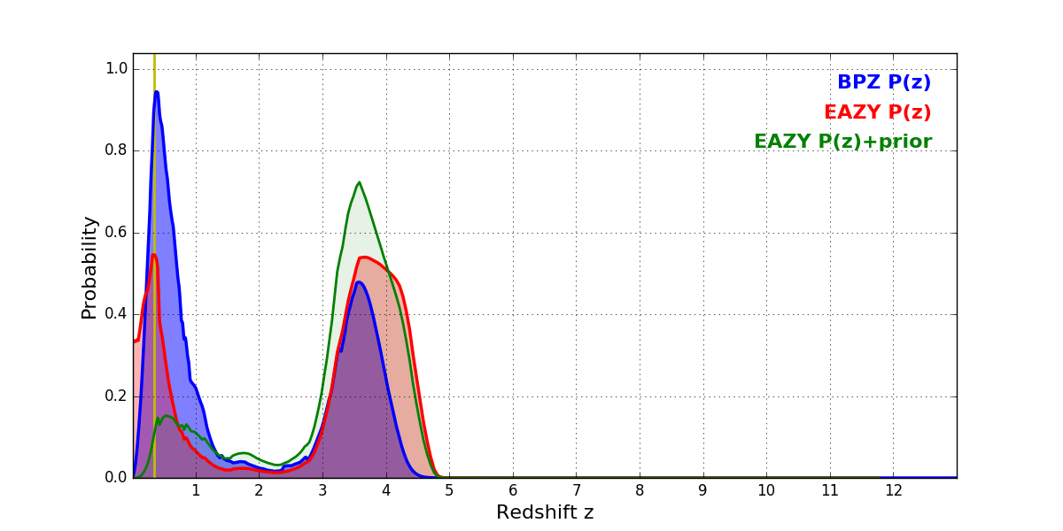 In P(z) plots: Yellow lines mark the cluster redshift z = 0.341,
