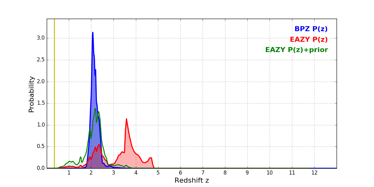 In P(z) plots: Yellow lines mark the cluster redshift z = 0.341,