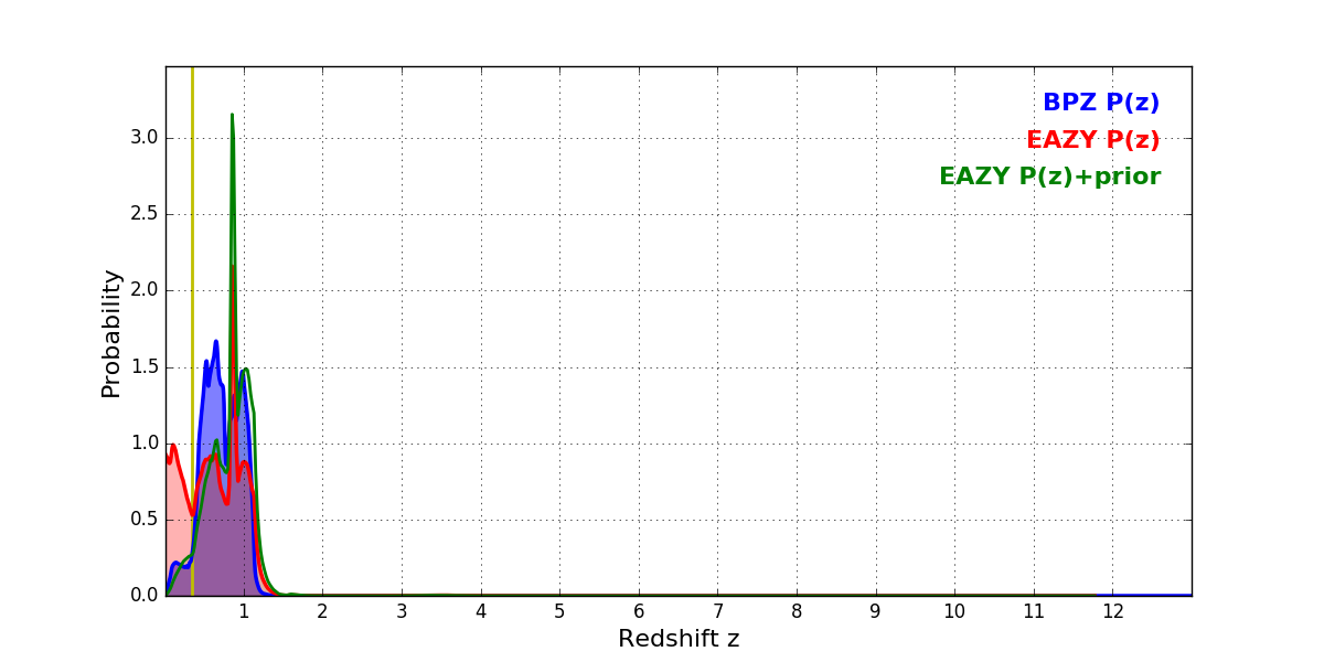In P(z) plots: Yellow lines mark the cluster redshift z = 0.341,