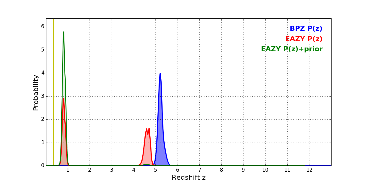 In P(z) plots: Yellow lines mark the cluster redshift z = 0.341,