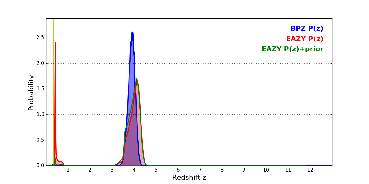 In P(z) plots: Yellow lines mark the cluster redshift z = 0.341,