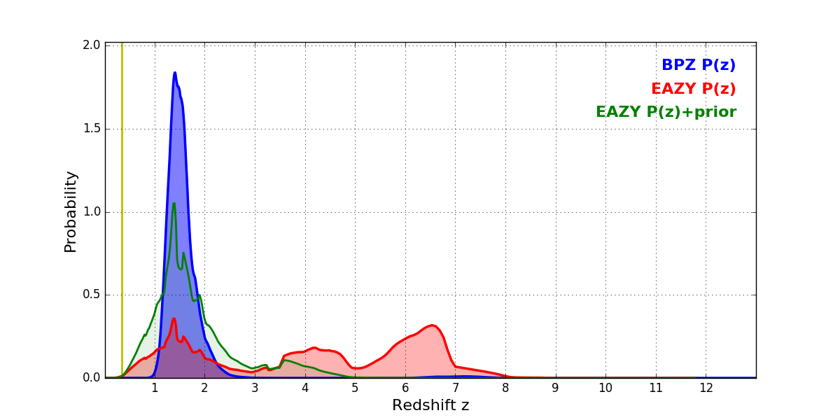 In P(z) plots: Yellow lines mark the cluster redshift z = 0.341,