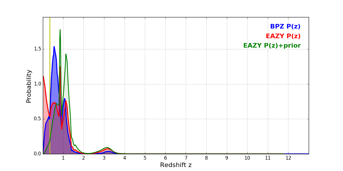 In P(z) plots: Yellow lines mark the cluster redshift z = 0.341,