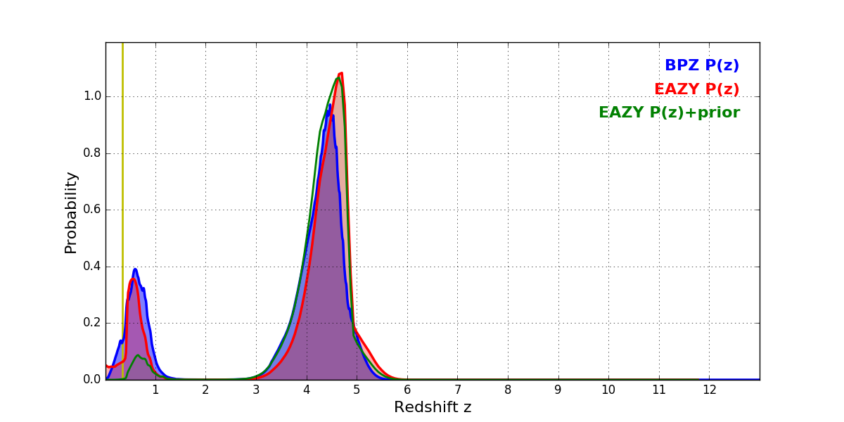 In P(z) plots: Yellow lines mark the cluster redshift z = 0.341,