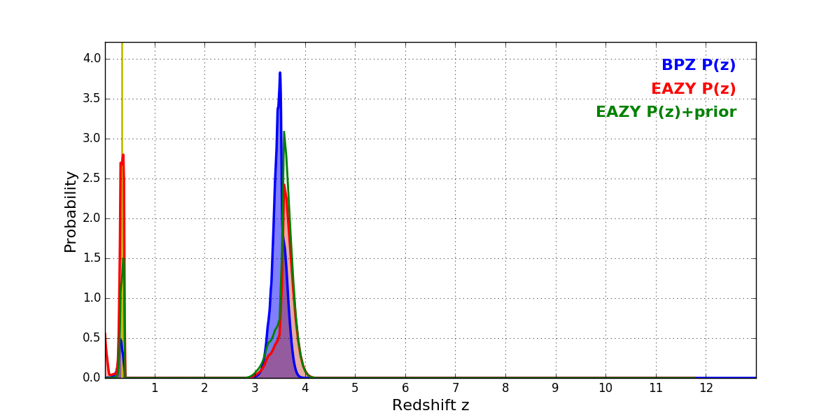 In P(z) plots: Yellow lines mark the cluster redshift z = 0.341,