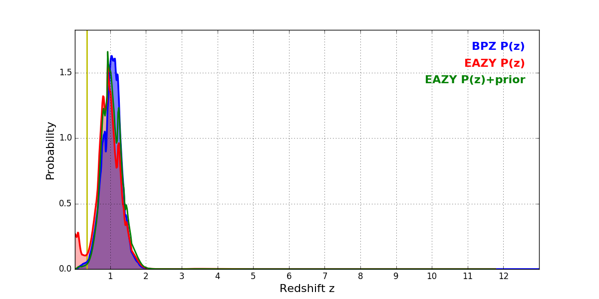 In P(z) plots: Yellow lines mark the cluster redshift z = 0.341,