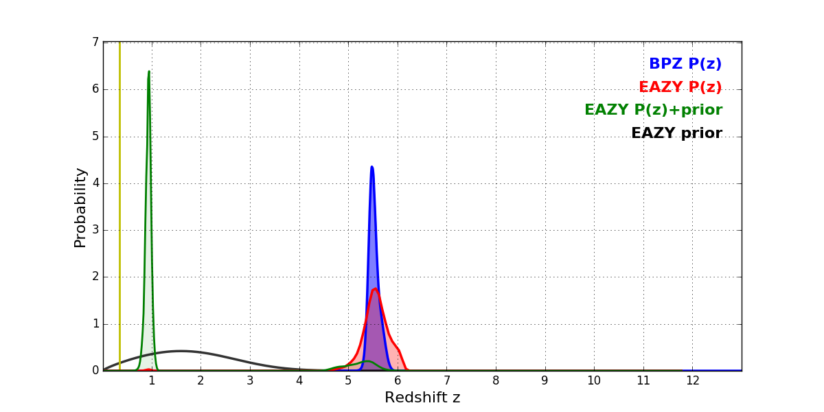 In P(z) plots: Yellow lines mark the cluster redshift z = 0.341,