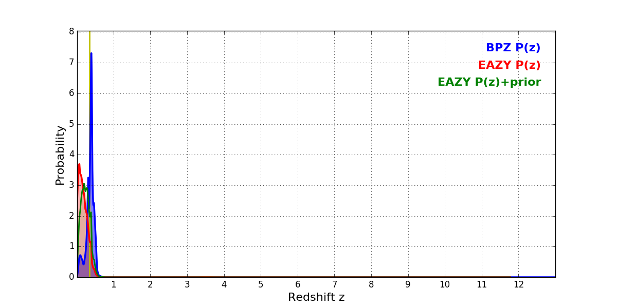 In P(z) plots: Yellow lines mark the cluster redshift z = 0.341,