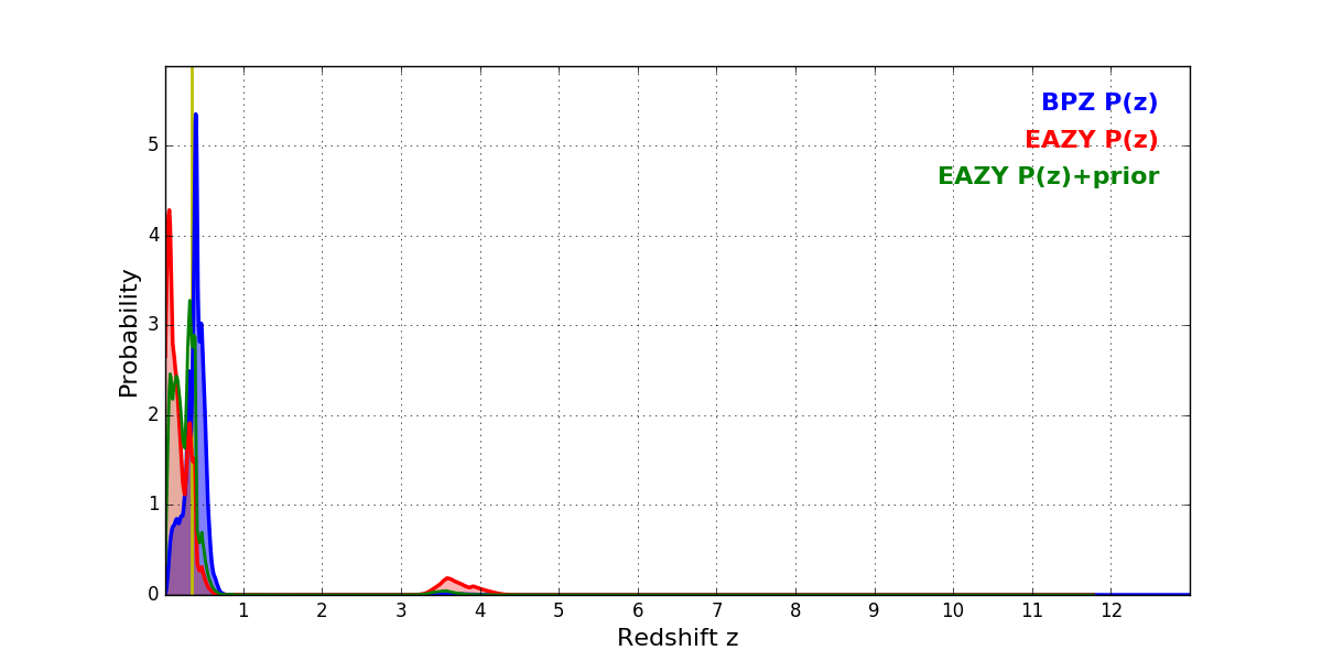 In P(z) plots: Yellow lines mark the cluster redshift z = 0.341,