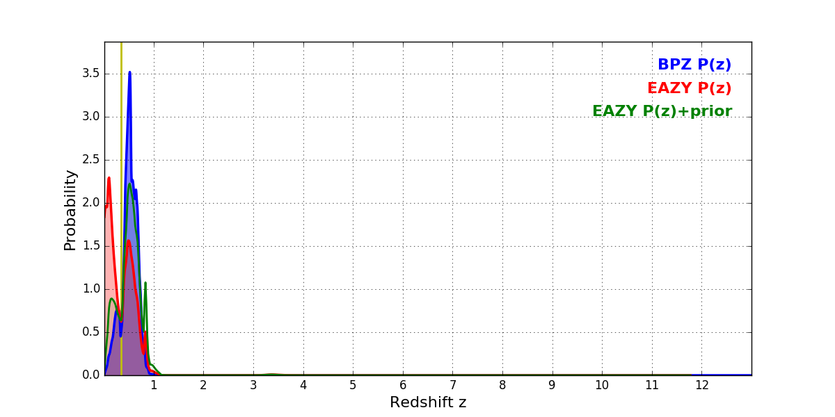 In P(z) plots: Yellow lines mark the cluster redshift z = 0.341,