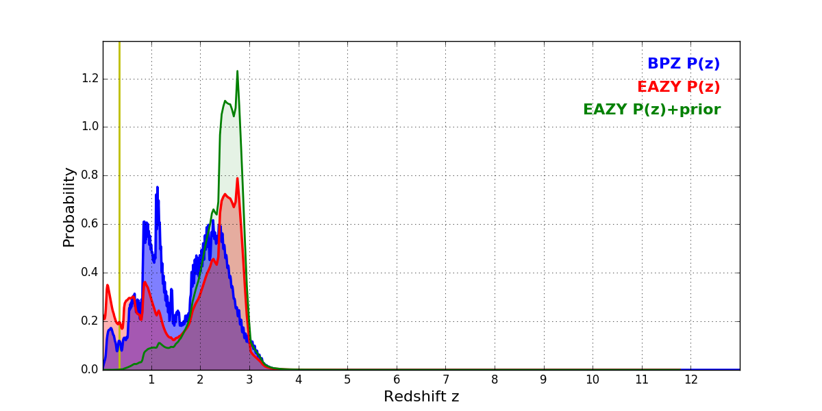 In P(z) plots: Yellow lines mark the cluster redshift z = 0.341,