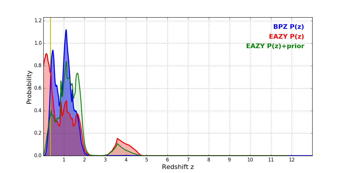 In P(z) plots: Yellow lines mark the cluster redshift z = 0.341,