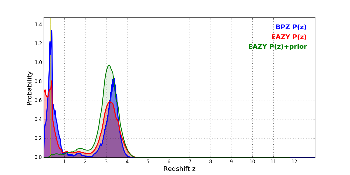 In P(z) plots: Yellow lines mark the cluster redshift z = 0.341,