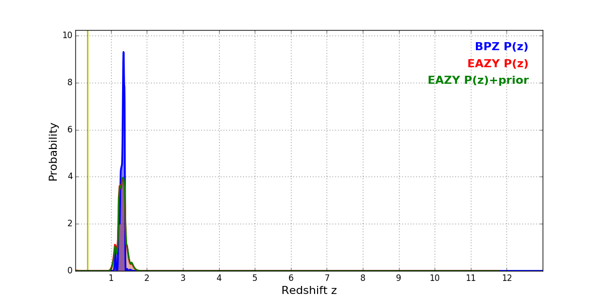 In P(z) plots: Yellow lines mark the cluster redshift z = 0.341,