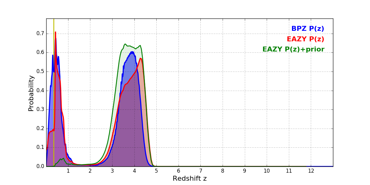 In P(z) plots: Yellow lines mark the cluster redshift z = 0.341,