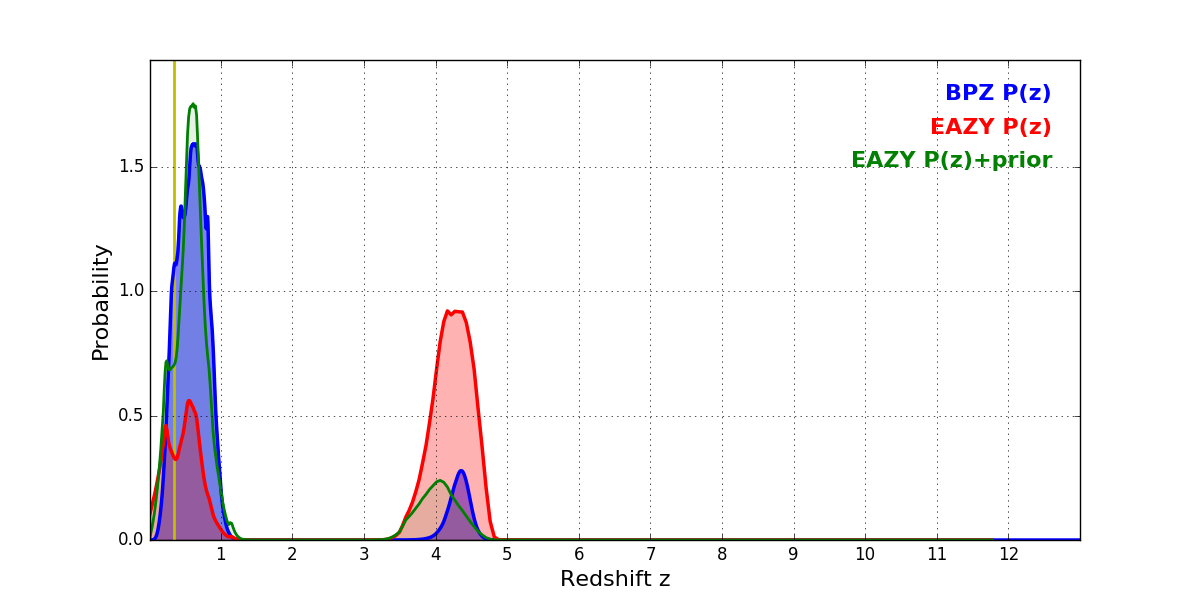 In P(z) plots: Yellow lines mark the cluster redshift z = 0.341,