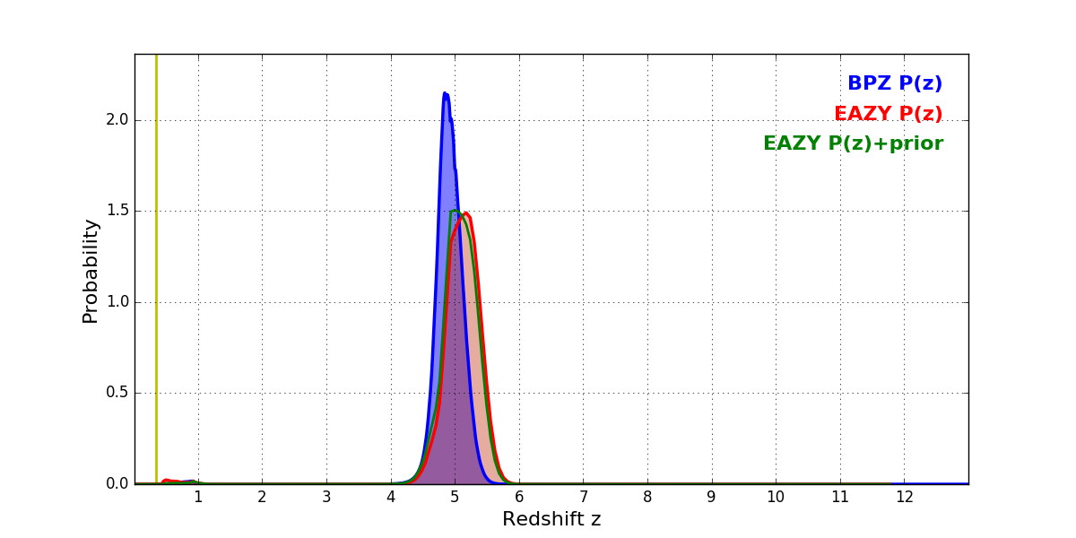 In P(z) plots: Yellow lines mark the cluster redshift z = 0.341,