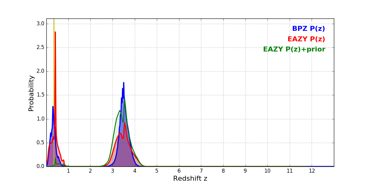 In P(z) plots: Yellow lines mark the cluster redshift z = 0.341,
