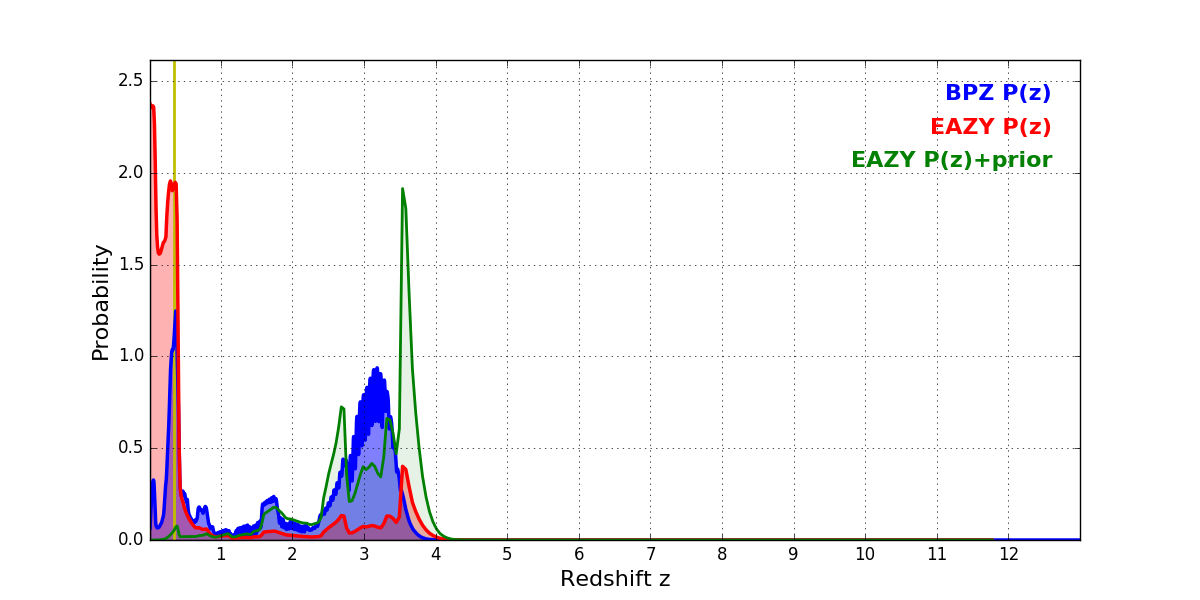 In P(z) plots: Yellow lines mark the cluster redshift z = 0.341,