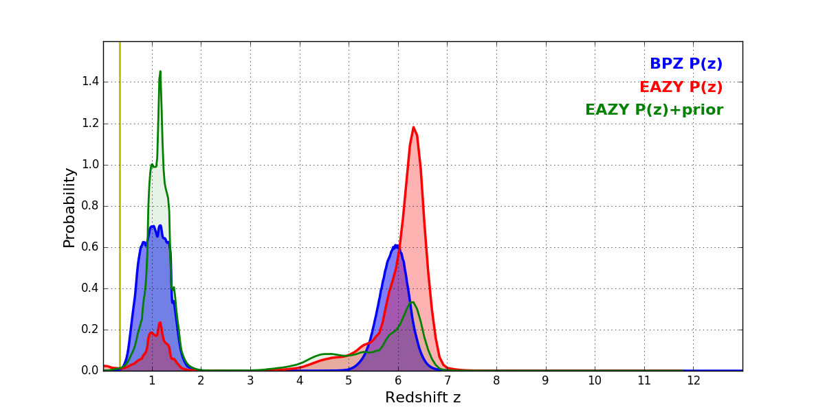 In P(z) plots: Yellow lines mark the cluster redshift z = 0.341,